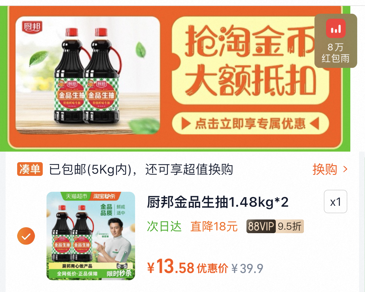 6.7/瓶下拉详情拍13.5亓 厨邦金品生抽1.48kg*2瓶 好单发报员 2025年11月25日 00:19 0 举报 6.7/瓶下拉详情拍13.5亓厨邦金品生抽1.48kg*2瓶https://m.tb.cn/h.SDRIelf 复制文案