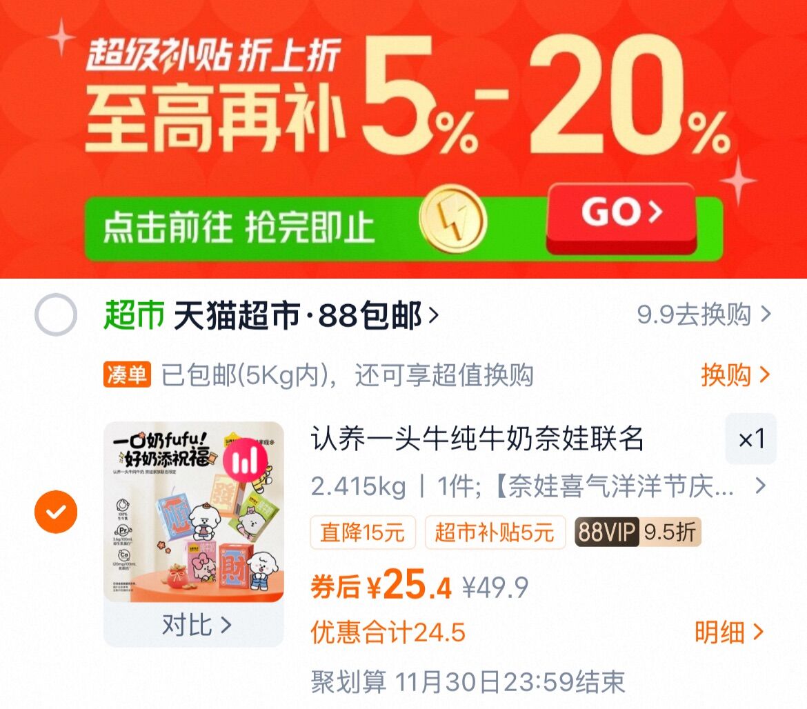 下拉拍,vip 25.4亓 认养一头牛 奈娃家族纯牛奶125ml*16盒好单发报员2025年11月25日 13:570举报 下拉拍,vip 25.4亓认养一头牛 奈娃家族纯牛奶125ml*16盒https://m.tb.cn/h.SxpgYfP复制文案