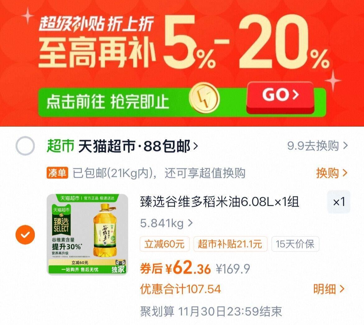 下拉拍,88vip 62.3亓 金龙鱼 谷维多稻米油6.08升好单发报员2025年11月26日 21:240举报 下拉拍,88vip 62.3亓金龙鱼 谷维多稻米油6.08升https://m.tb.cn/h.SCrZD8h复制文案