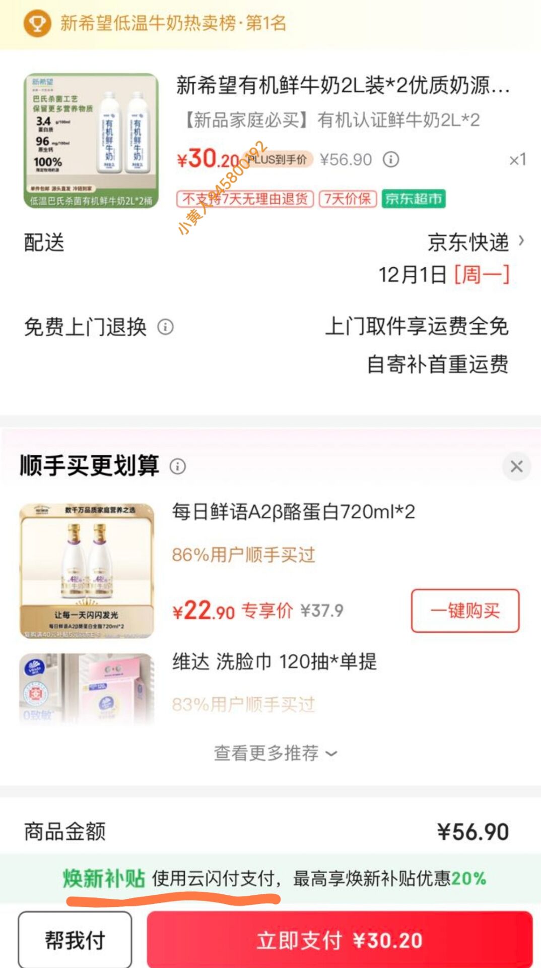 新希望 有机鲜牛奶 2L*2瓶,plus云闪付结算8折到手24.1