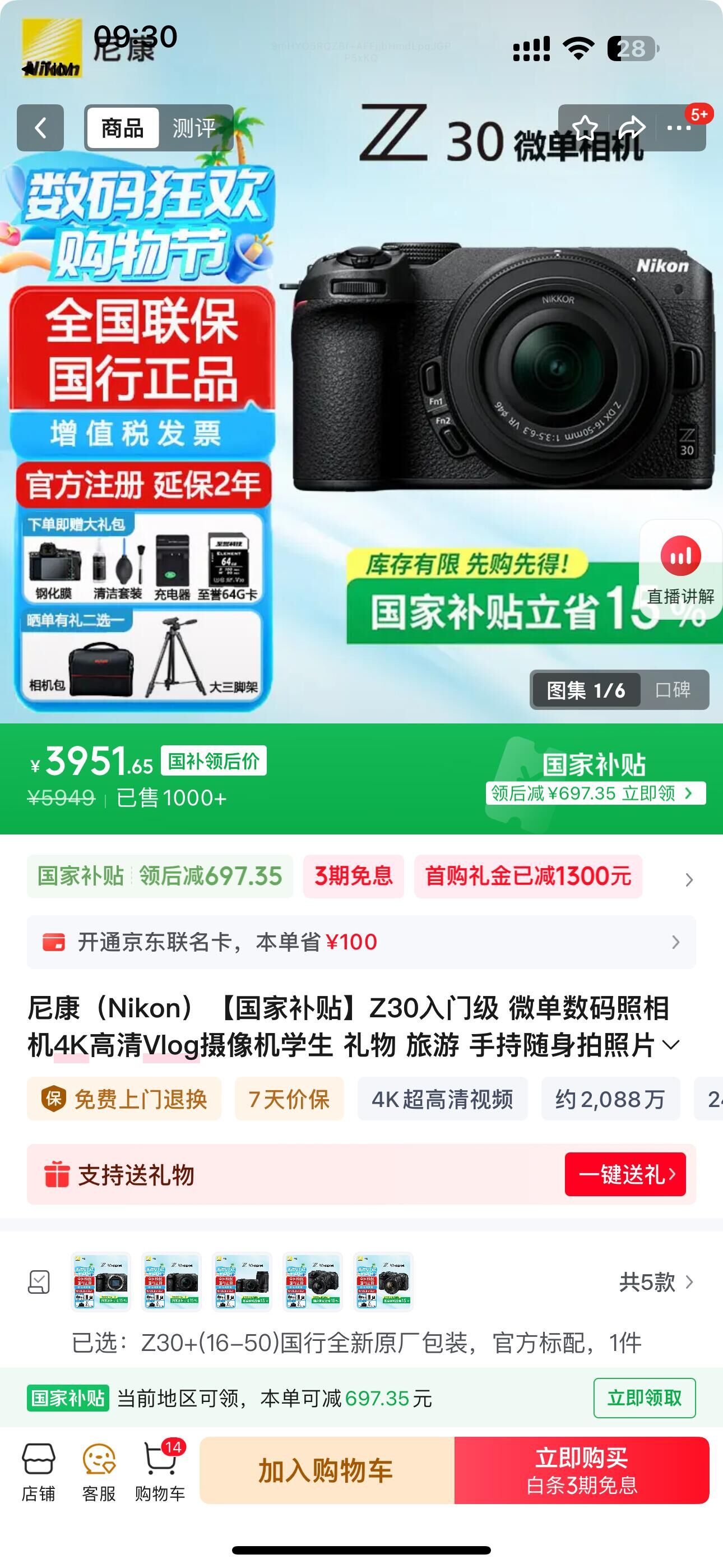 尼康 Z30 半画幅微单相机 16-50mm 套机 3951.65 上海四川囯补好单发报员2025年12月05日 09:310举报 尼康 Z30 半画幅微单相机 16-50mm 套机【3951.65】上海四川囯补https://u.jd.com/ZDMX1Hy复制文案