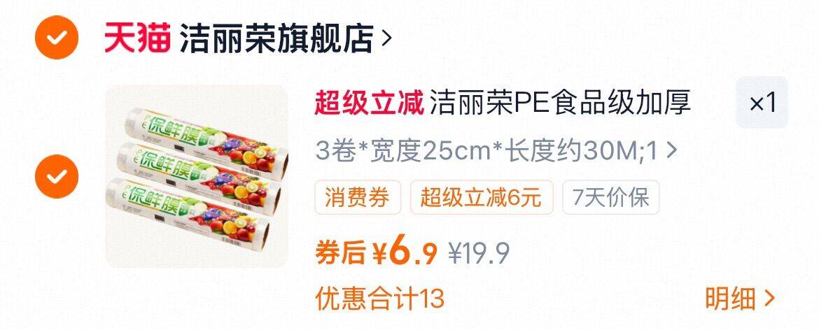 6.9亓 2.3/卷 好扴~ 洁丽荣保鲜膜PE加厚30米*3卷 好单发报员 2025年12月05日 13:53 0 举报 6.9亓(2.3/卷)好扴~洁丽荣保鲜膜PE加厚30米*3卷https://m.tb.cn/h.7Z6laSw 复制文案