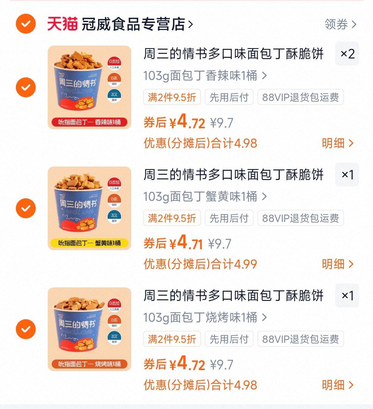周三的情书多口味面包丁 任选件18元.8,折4.7/桶! 好单发报员 2025年12月05日 15:27 0 举报 周三的情书多口味面包丁任选件18元.8,折4.7/桶!https://m.tb.cn/h.7aqsLOe 复制文案