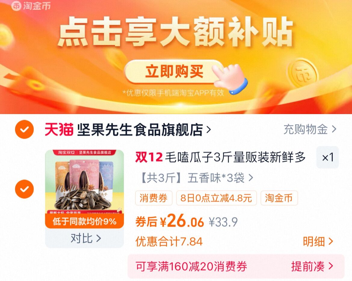 下拉详情拍 26 8.6/袋 洽洽 毛嗑瓜子500g*3袋 好单发报员 2025年12月07日 10:29 0 举报 下拉详情拍26(8.6/袋)洽洽 毛嗑瓜子500g*3袋https://m.tb.cn/h.70URV5I 复制文案