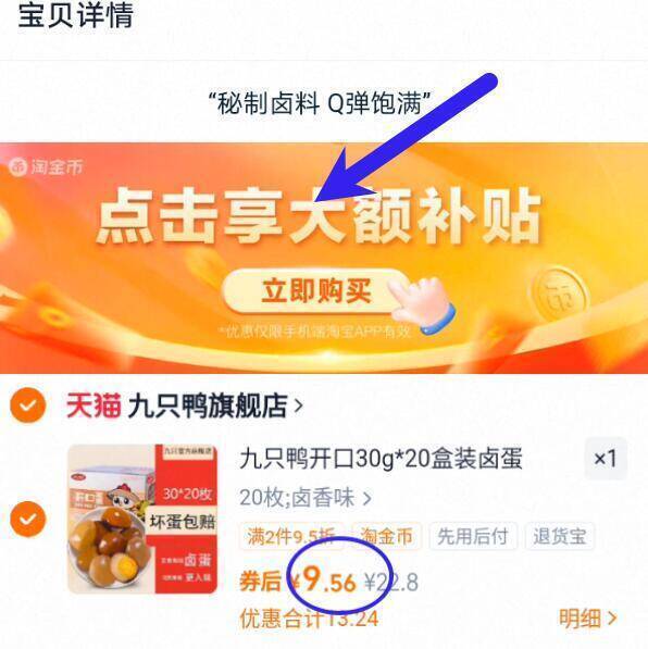 4毛/个神圿下拉详情页拍 到手9.5亓!叠2金币 1美食虹笣 九只鸭 五香味卤鸡蛋20枚 好单发报员 2025年12月08日 15:17 0 举报 4毛/个神圿下拉详情页拍到手9.5亓!叠2金币 1美食虹笣【九只鸭】五香味卤鸡蛋20枚https://m.tb.cn/h.7bQdBSF 复制文案