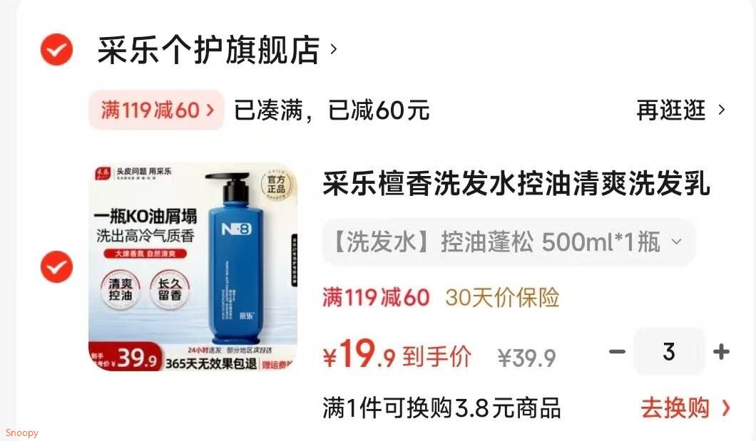 采乐 檀香洗发水 控油蓬松 500ml*1瓶,拍3件【59】