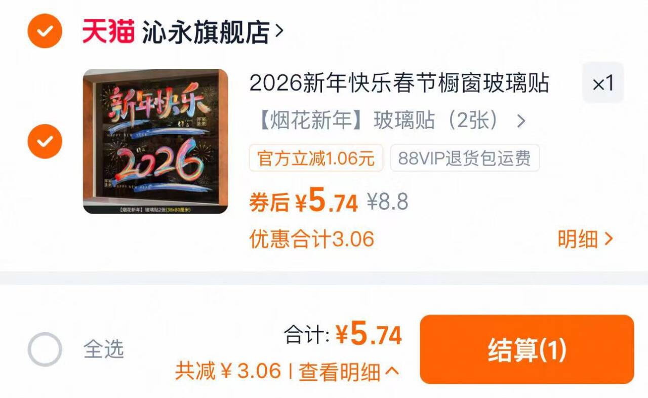 5.74亓 沁永旗舰店 多款可选 到手2张 沁永2026新年春节玻璃贴2张 好单发报员 2025年12月09日 14:37 0 举报 5.74亓 沁永旗舰店多款可选 到手2张沁永2026新年春节玻璃贴2张https://m.tb.cn/h.71YF1Qe 复制文案