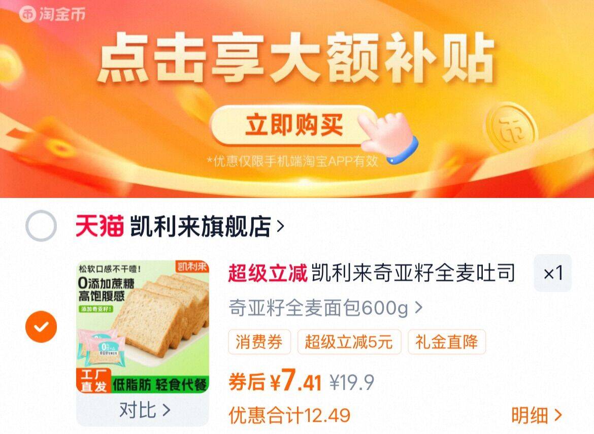 下拉详情拍,7.4亓 凯利来 奇亚籽全麦吐司600g 好单发报员 2025年12月09日 17:51 0 举报 下拉详情拍,7.4亓凯利来 奇亚籽全麦吐司600ghttps://m.tb.cn/h.7Ybt7uM 复制文案