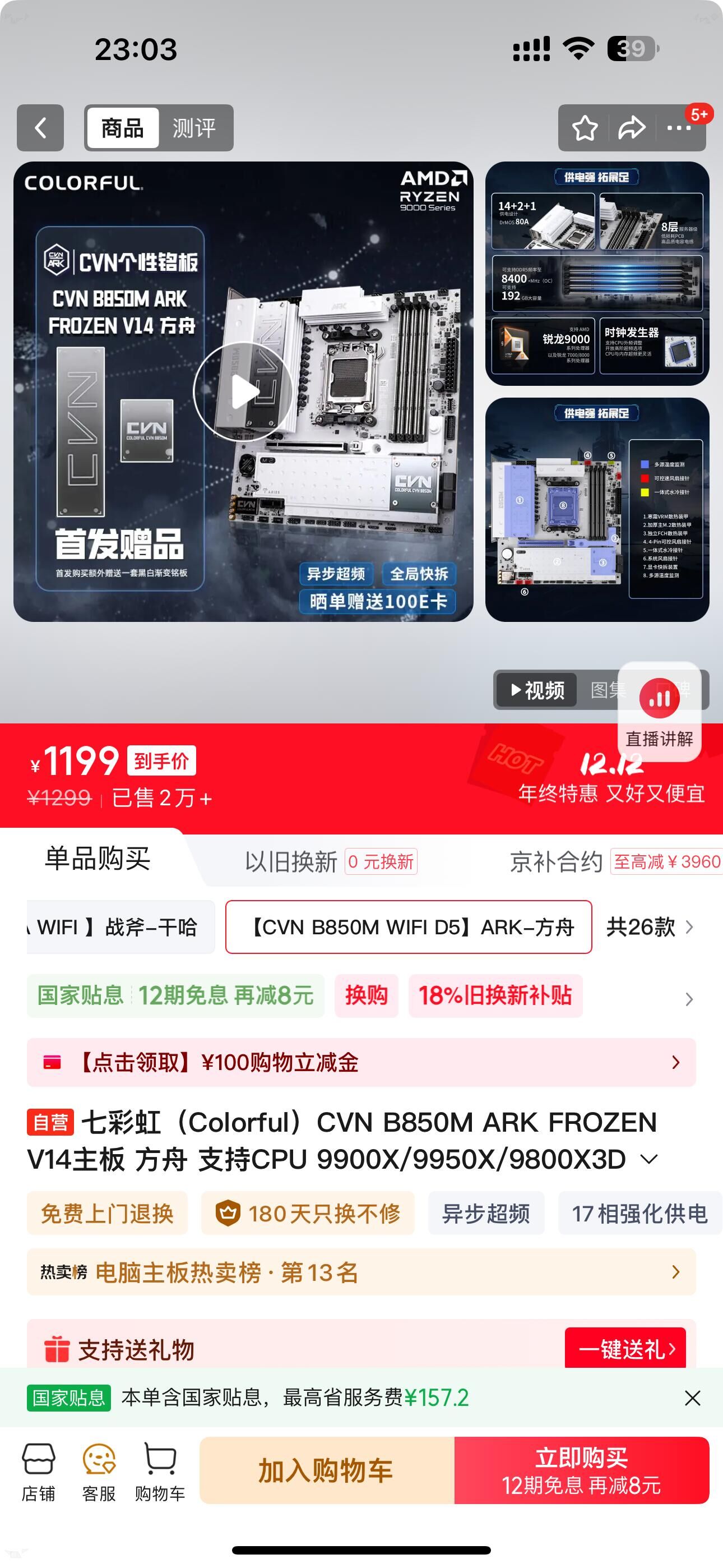 1099 晒返100 七彩虹CVN B850M ARK FROZEN V14主板 方舟 支持CPU 9900X/9950X/9800X3D AMD B850/socket AM5