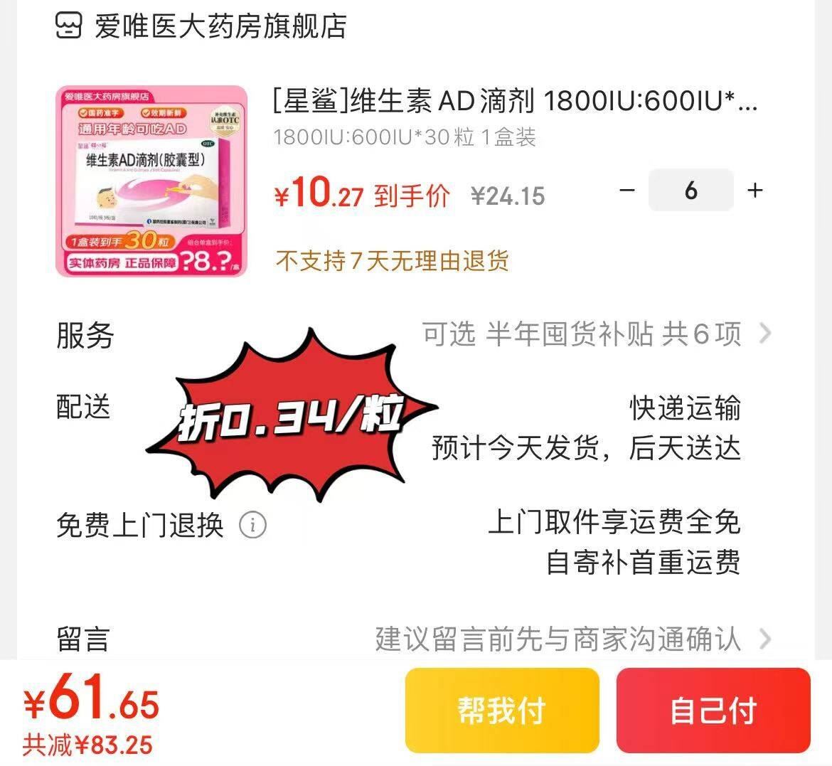折0.34元/粒 180粒61.6元! 星鲨 维生素AD滴剂30粒 拍6件 到手180粒,OTC版本更放心 好单发报员 2025年12月10日 11:00 0 举报 折0.34元/粒 180粒61.6元!星鲨 维生素AD滴剂30粒 拍6件https://u.jd.com/ZGDxyWu 到手180粒,OTC版本更放心 复制文案
