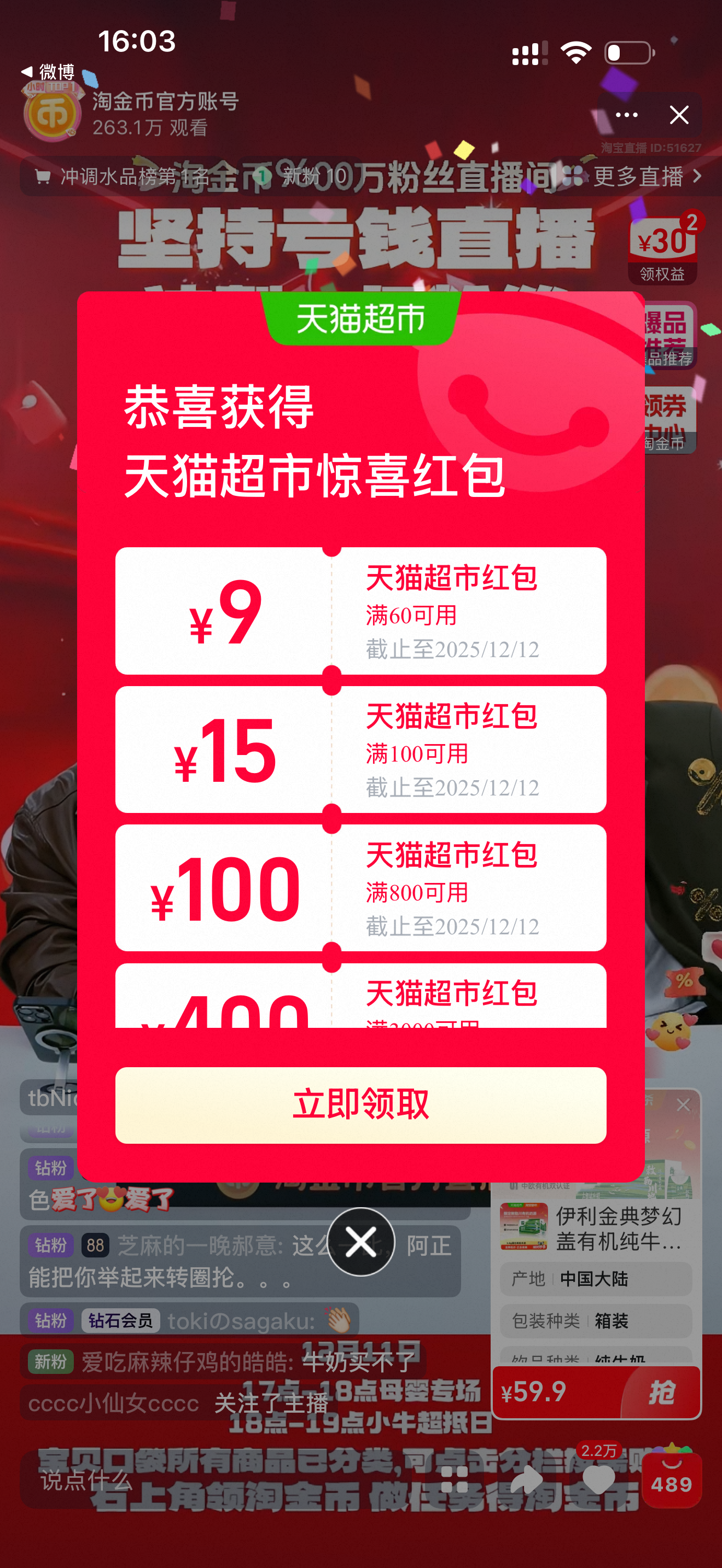 2进天猫超市直播间领9折劵,从购物袋加购1件https://www.taobao.com?ali_trackid=2:mm_130800803_2233600478_111189750478
