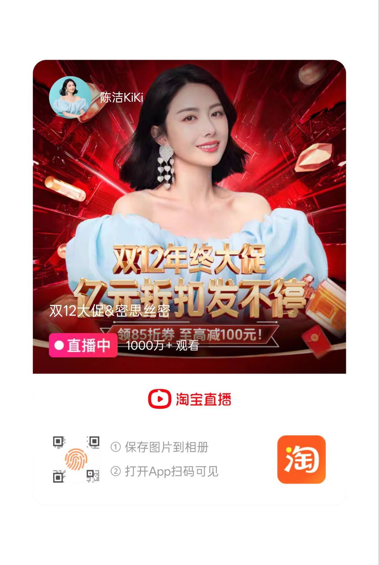 2,淘宝首页 - 淘宝直播 - 搜索陈洁KiKi直播间,会弹出85折优惠,进入搜索629号产品,拍1件;