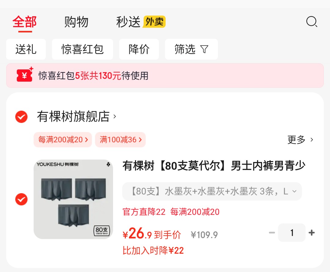 有棵树 80支莫代尔 男士四角短裤 3条【26.9】