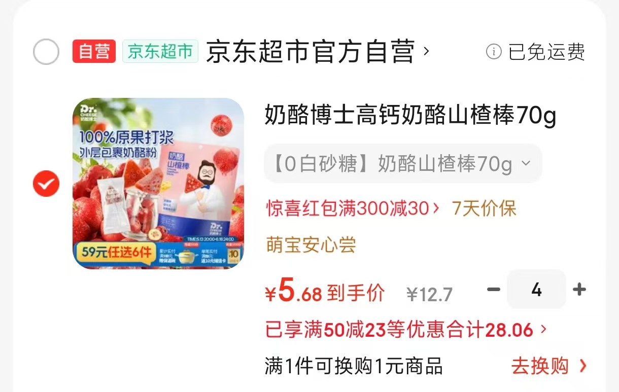 有需还可以,200-20 领50-23 奶酪博士 高钙奶酪山楂棒70g,拍4件 凑后 折5.6/件