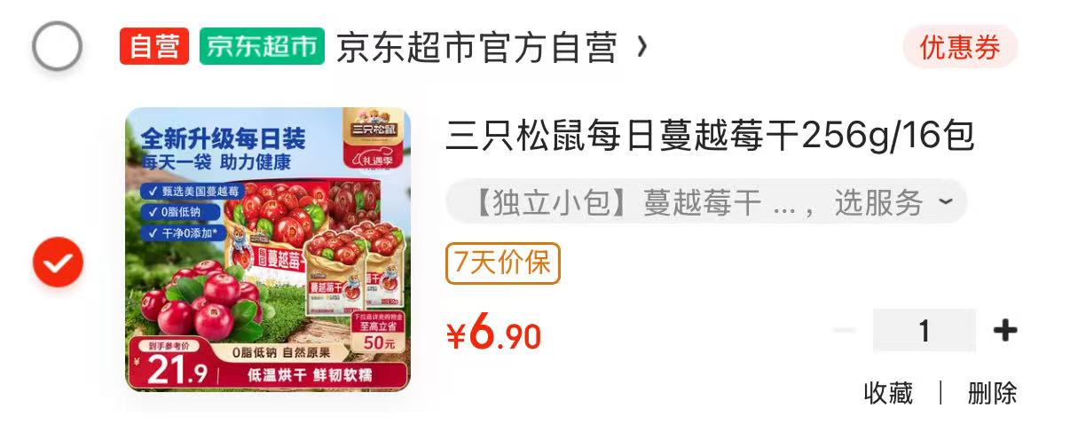 宁波 地区 三只松鼠每日蔓越莓干256g/16包 【6.9】