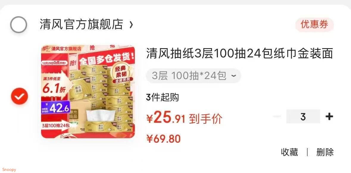 清风 抽纸3层100抽24包,拍3件 折单价25.9