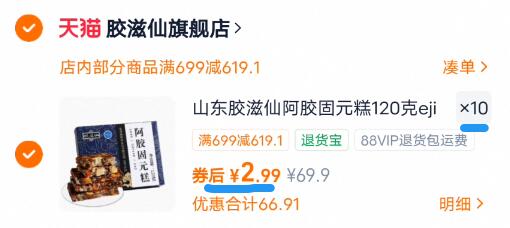 2.9亓/盒快锁10件29.8亓 胶滋仙 阿胶固亓糕120g*10盒 好单发报员 2026年01月01日 19:12 0 举报 2.9亓/盒快锁10件29.8亓【胶滋仙】阿胶固亓糕120g*10盒https://m.tb.cn/h.7h4Guf9 复制文案