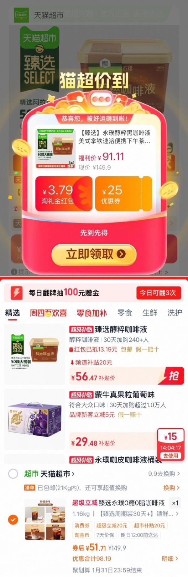 详情页进入超级补贴加购,右下角悬浮窗领59-9红包