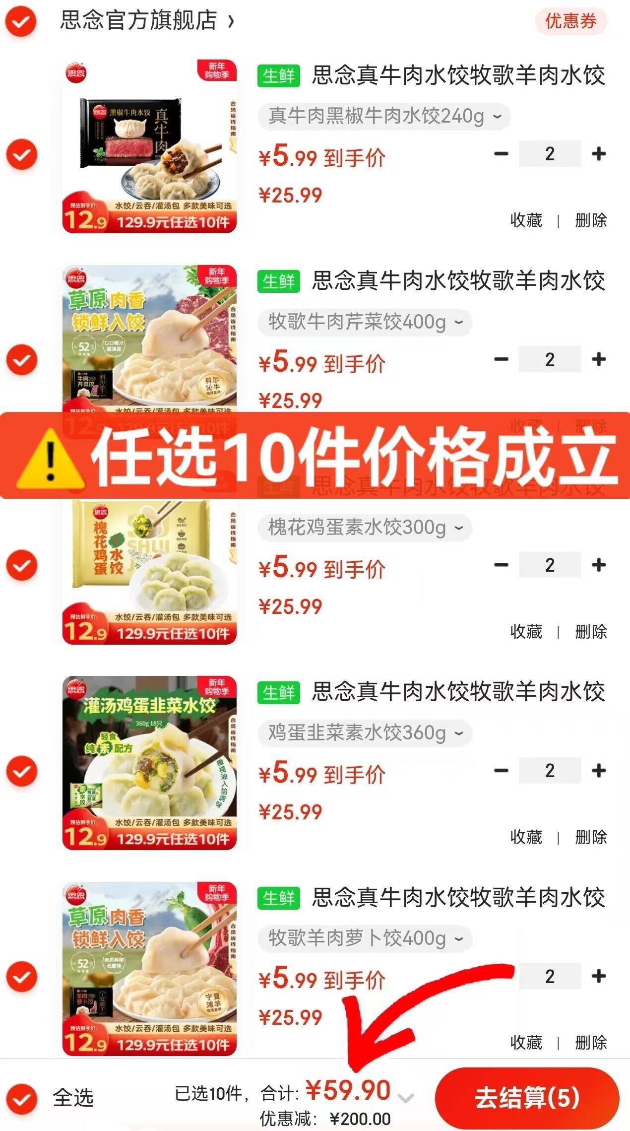 思念水饺发車 思念 牛羊肉水饺/素水饺/馄饨 任选10件59.9亓,折5.9亓/件 好单发报员 2026年01月02日 11:27 0 举报 ——思念水饺发車——思念 牛羊肉水饺/素水饺/馄饨https://u.jd.com/Aackztt任选10件59.9亓,折5.9亓/件*日常8件要卖59.9亓 真材实料 复制文案