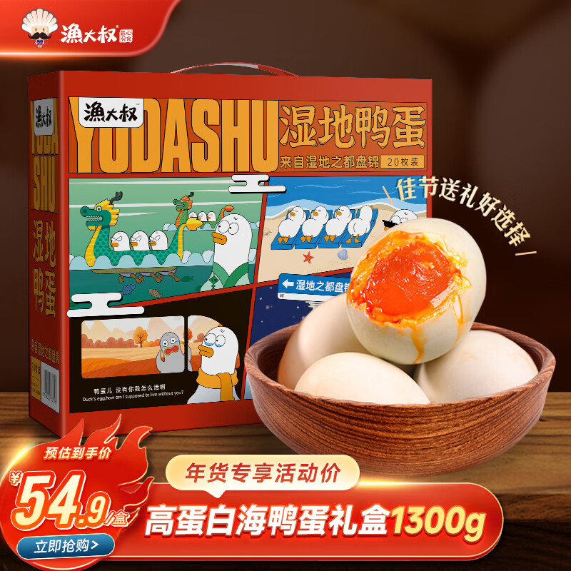 【JD自营】渔大叔 湿地咸鸭蛋红心流油海鸭蛋65g 20枚礼盒