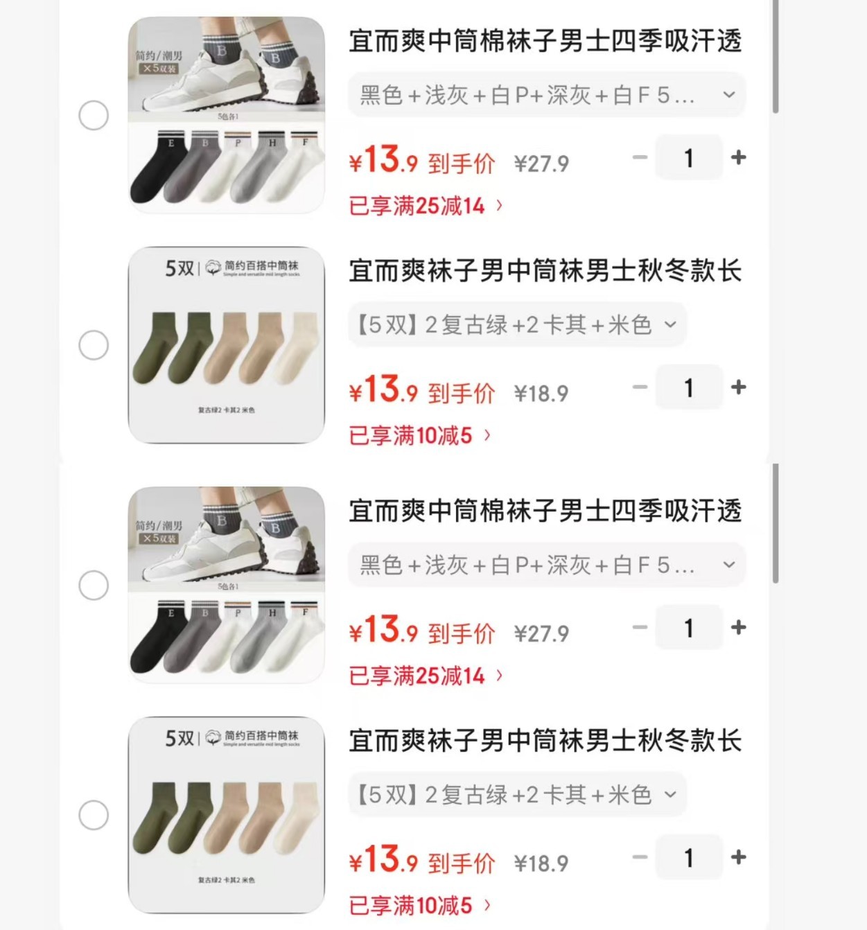 宜而爽 袜子男中筒袜 5双【13.9】