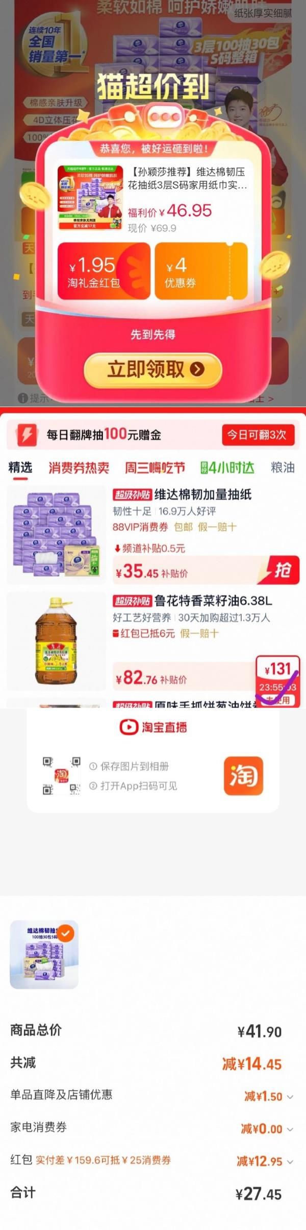 详情页进入超级补贴加购,右下角悬浮窗领39-6鸿包
