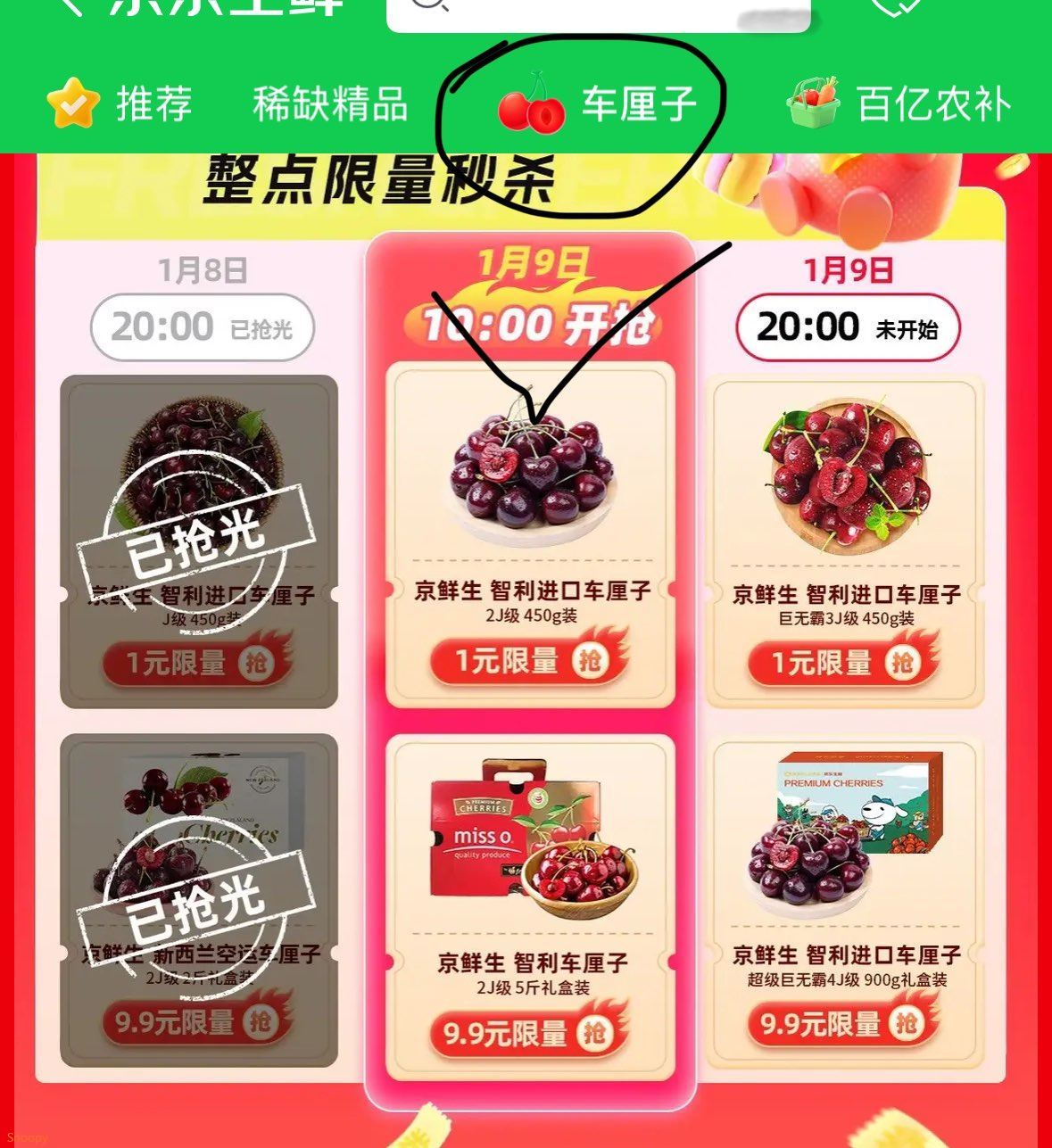 10点 会场上方切车厘子 下拉抢1亓车厘子