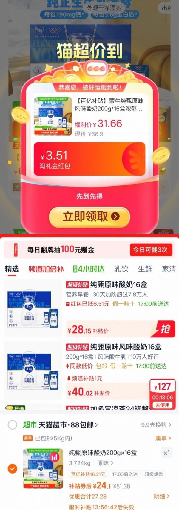 蒙牛纯甄原味风味酸奶200g*16盒,领礼金