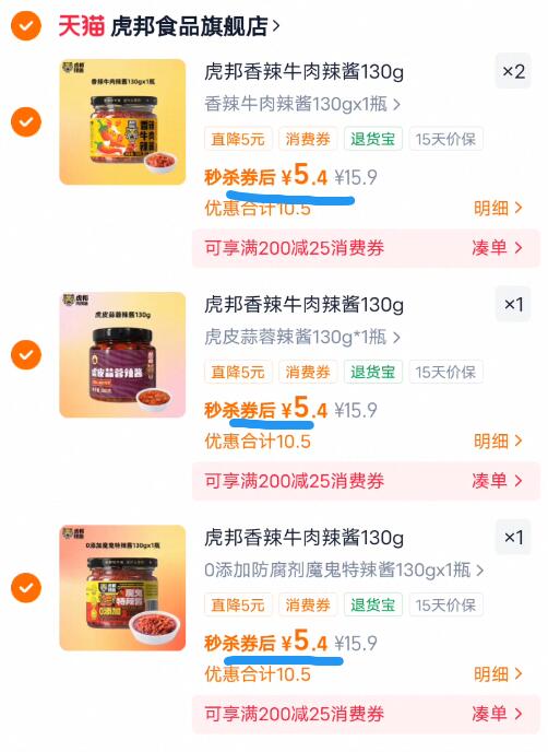 5.4亓/瓶速全部任选 任选4件21.6亓,拌饭沾酱无敌香 虎邦 香辣牛肉酱130g 好单发报员 2026年01月11日 20:03 0 举报 5.4亓/瓶速全部任选任选4件21.6亓,拌饭沾酱无敌香【虎邦】香辣牛肉酱130ghttps://m.tb.cn/h.79KgmK1 复制文案