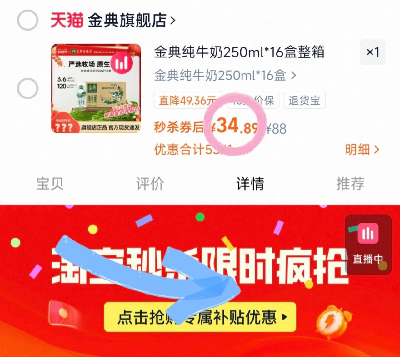 快34元/大箱金典纯牛奶 34250元ml*16盒大箱 叠礼金下拉详情秒拍