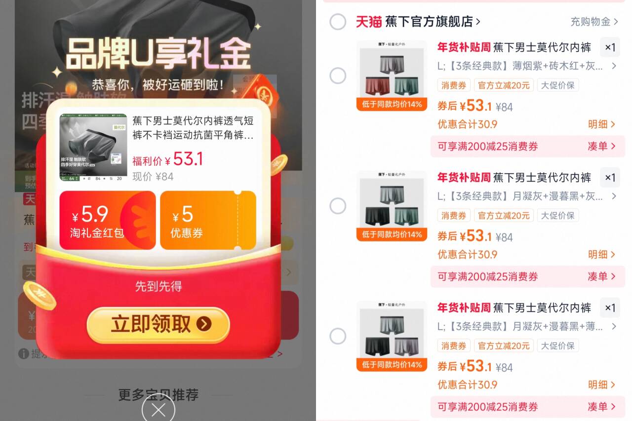 蕉下男莫代尔内裤条53元