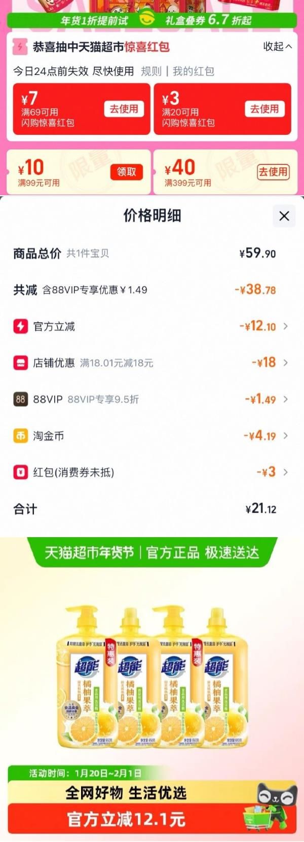 详情页进入淘金币页面下单,拍1件vip【21.12】