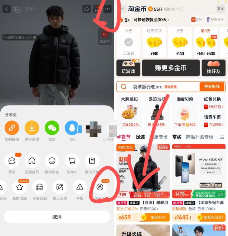 1.商品右上角3个点,选淘金币