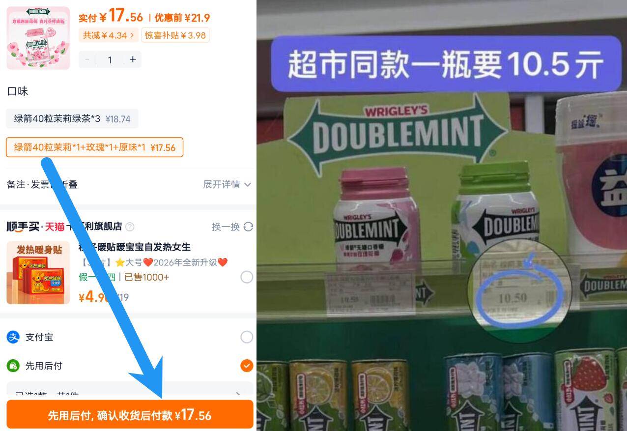 17.9亓限时百亿补贴 绿箭 口香糖40粒*3瓶 圿格不对 下拉详情拍 好单发报员 2026年01月24日 16:25 0 举报 17.9亓限时百亿补贴【绿箭】口香糖40粒*3瓶圿格不对 下拉详情拍https://m.tb.cn/h.7oSSBTP拍第2选项,线下1瓶10.5亓 复制文案