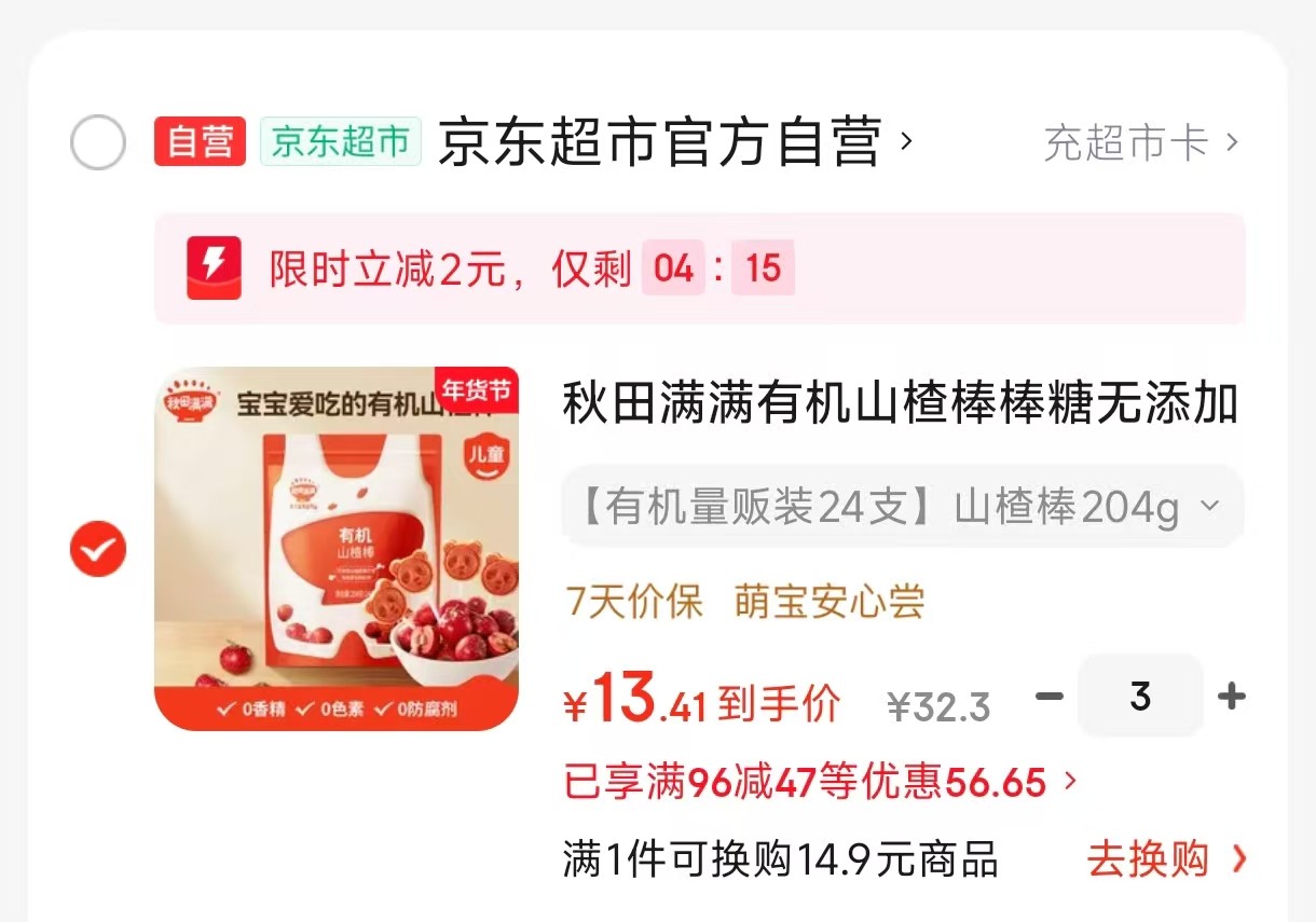 秋田满满 有机山楂棒棒糖无添加204g¥24根装),拍3件 折13.4/件