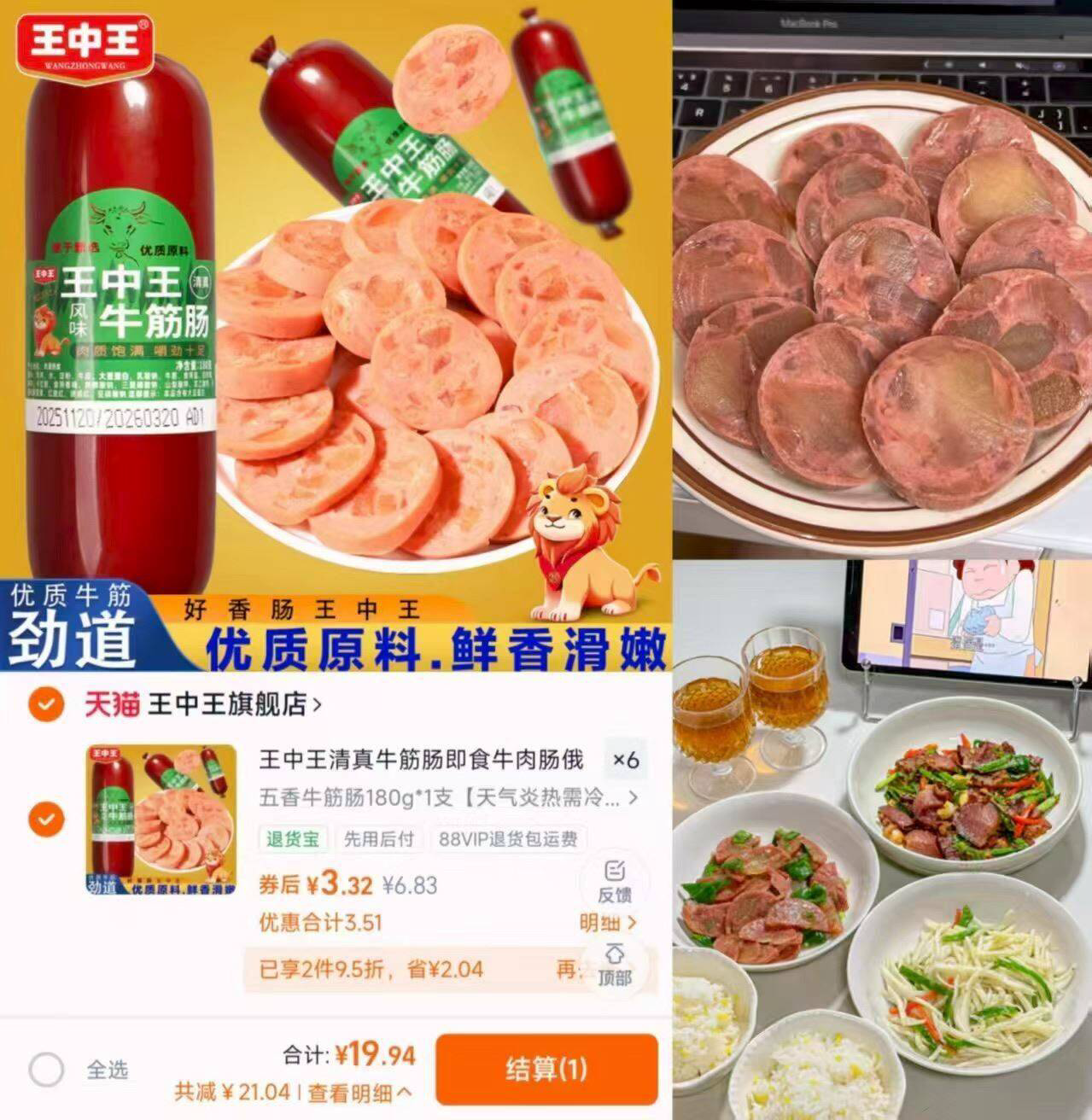 王中王劲道Q弹牛筋肠 3.3/根拍6件19元.9元 切成片撒点葱就是一盘菜!好单发报员2026年01月26日 15:410举报 王中王劲道Q弹牛筋肠3.3/根拍6件19元.9元切成片撒点葱就是一盘菜!可以当过年待客菜多备点~180g的,线下得8-10块/根-https://m.tb.cn/h.7pFFX8w复制文案