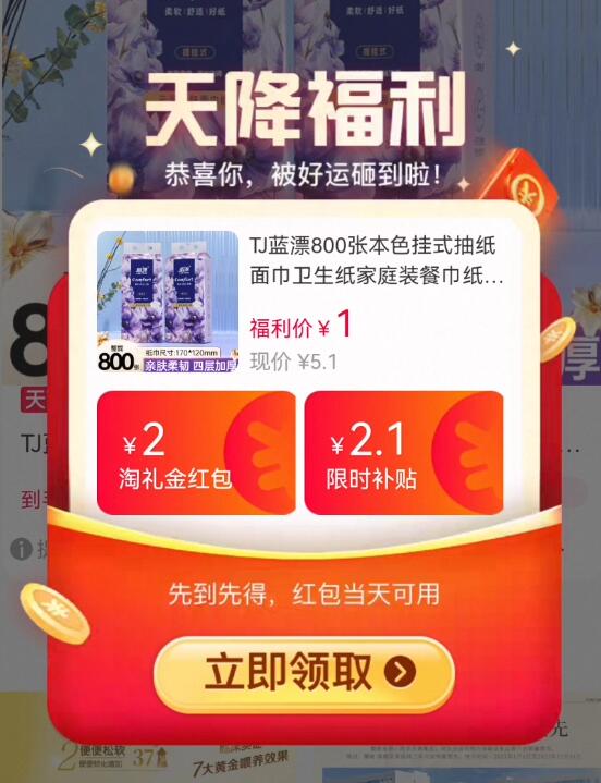 1亓速!限时礼金 蓝漂本色挂式抽纸800张