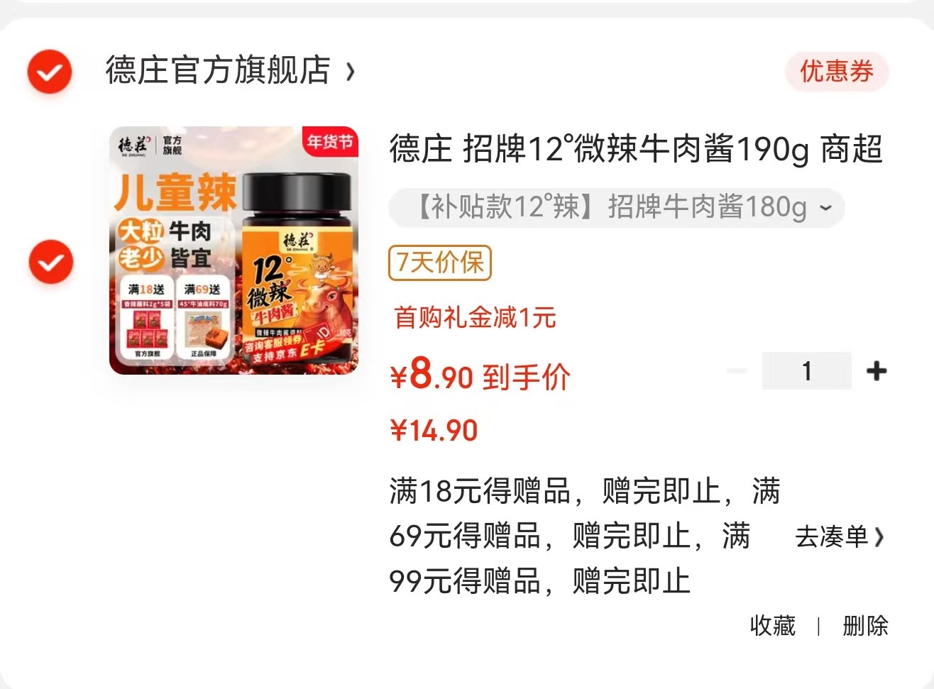 德庄 招牌12°微辣 招牌牛肉酱180g,如有1首单【8.9】