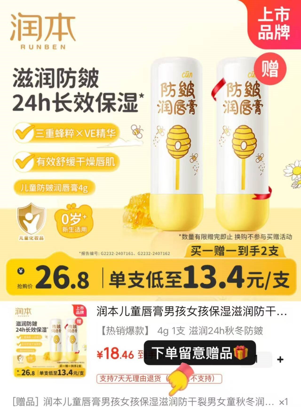 儿童唇膏发車 润本 防皴款儿童润唇膏4g*2支 19.8亓,Plus到手付18.4亓好单发报员2026年01月27日 13:160举报 ——儿童唇膏发車——润本 防皴款儿童润唇膏4g*2支https://u.jd.com/JazBcIh19.8亓,Plus到手付18.4亓*果油精华 成分安全 妈妈放心复制文案