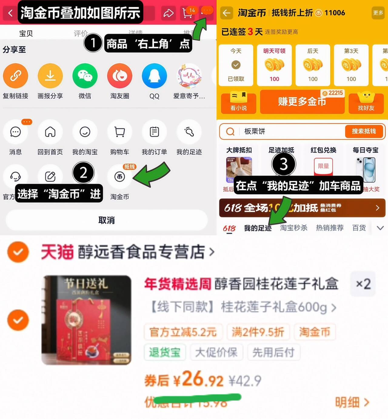 1、如图点右上角3个点,选淘金币