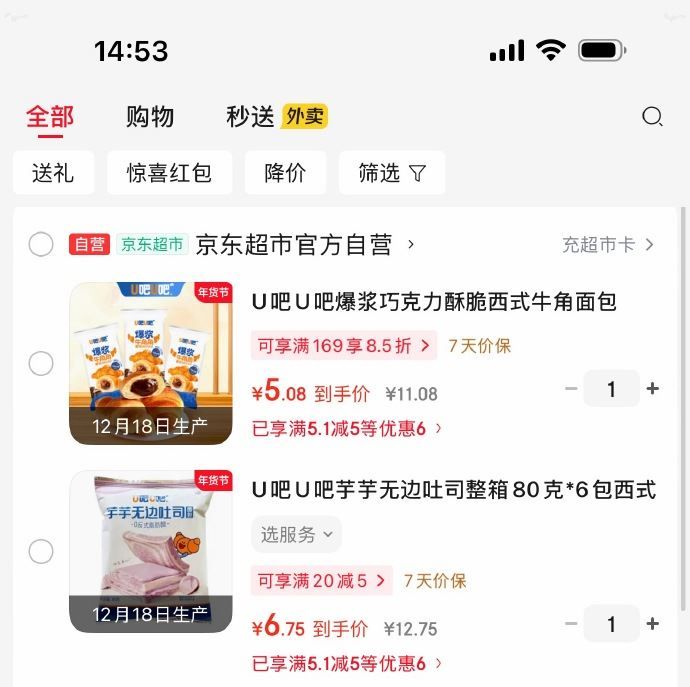 U吧U吧爆浆巧克力牛角面包75g*4包,【5.08】