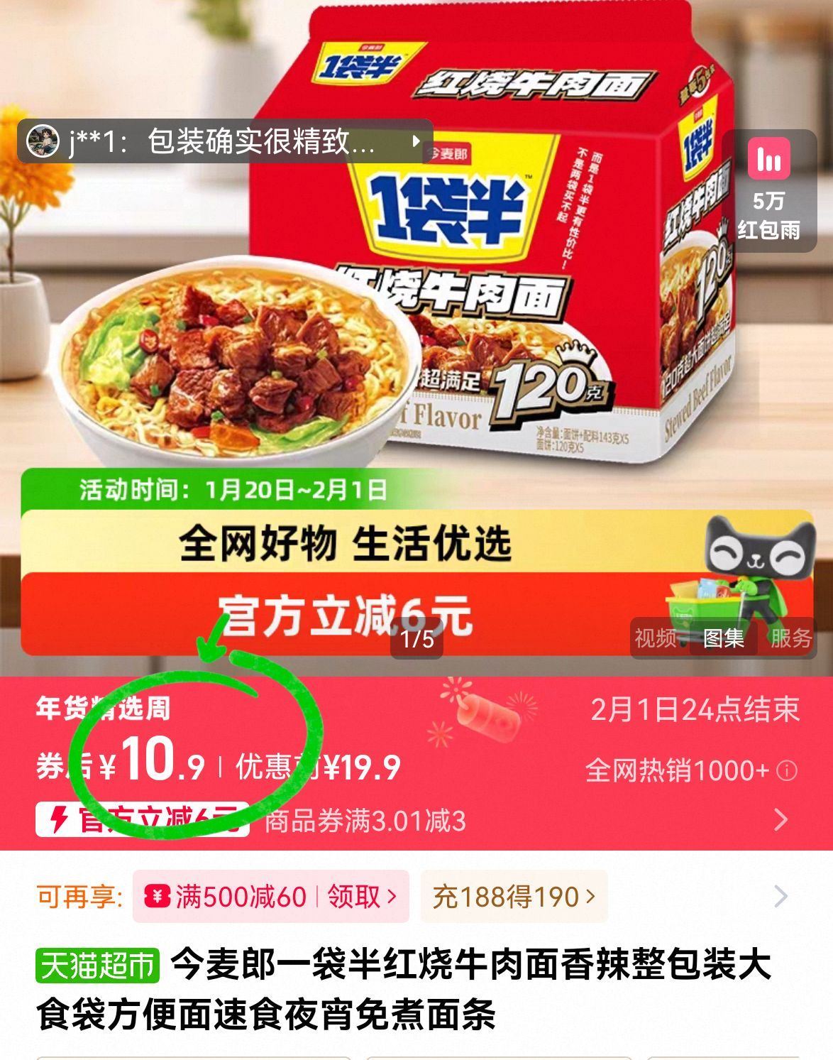 10.9亓元红烧牛肉味 今麦郎 方便面5袋装 家里速食缺货的快安排啦 好单发报员 2026年01月27日 15:11 0 举报 10.9亓元红烧牛肉味【今麦郎】方便面5袋装家里速食缺货的快安排啦汤味浓郁 口感劲道弹牙哇-https://m.tb.cn/h.7KKlEJ4 复制文案