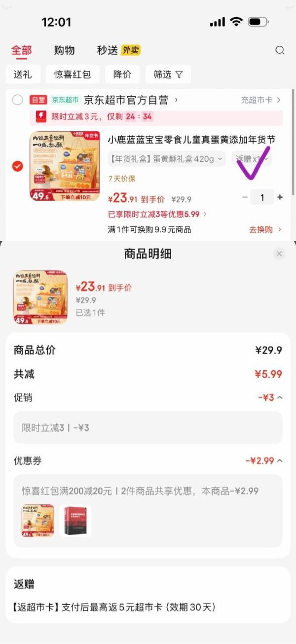 弹3立减,凑后【23.91】返5卡
