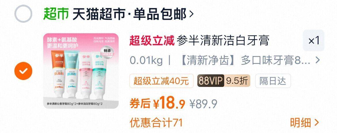 vip 18.9,折4.7亓/支 参半 氨基酸净齿牙膏80g*4支好单发报员2026年01月28日 15:590举报 vip 18.9,折4.7亓/支参半 氨基酸净齿牙膏80g*4支https://m.tb.cn/h.7JOpKX0复制文案