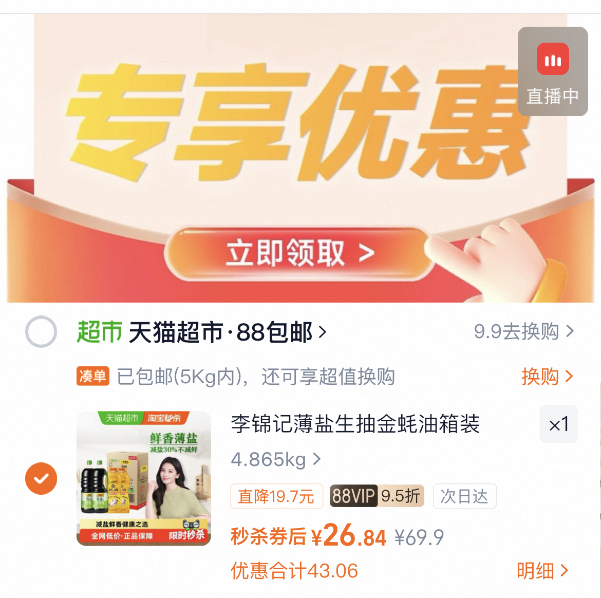 下拉详情拍,26.8亓 李锦记薄盐生抽1.52kg*2 金蚝油550*2好单发报员2026年01月28日 19:120举报 下拉详情拍,26.8亓李锦记薄盐生抽1.52kg*2 金蚝油550*2https://m.tb.cn/h.7qgZ3OR复制文案