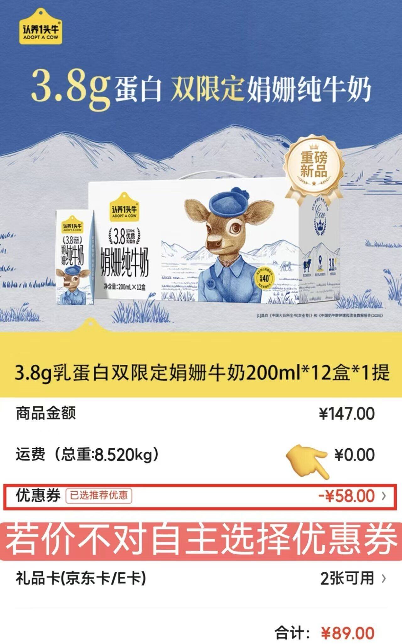 高端纯奶降忦啦 自营 认养一头牛 3.8g 乳蛋白娟姗纯奶200ml*12盒 好单发报员 2026年01月29日 08:03 0 举报 ——高端纯奶降忦啦——【自营】认养一头牛 3.8g乳蛋白娟姗纯奶200ml*12盒https://u.jd.com/J1riUi4买3件实.付89亓,日常99亓*奶源稀缺 自喝送礼都很不错 复制文案