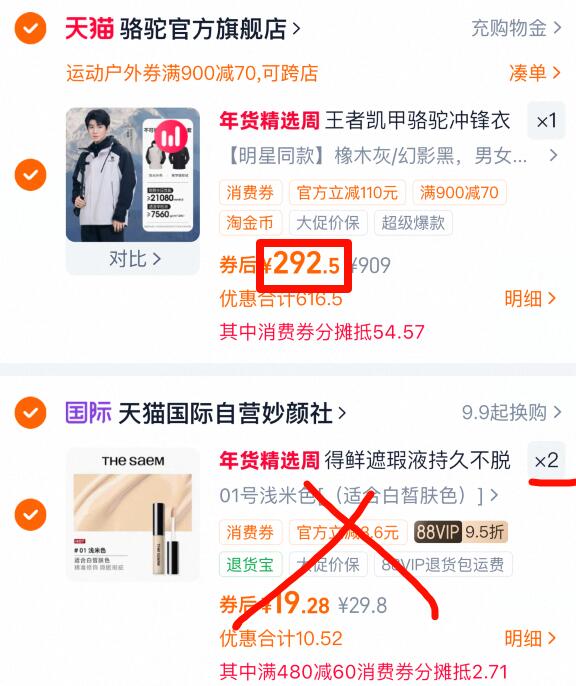 3、凑单商品加购 2件 一起付款然后退掉凑单
