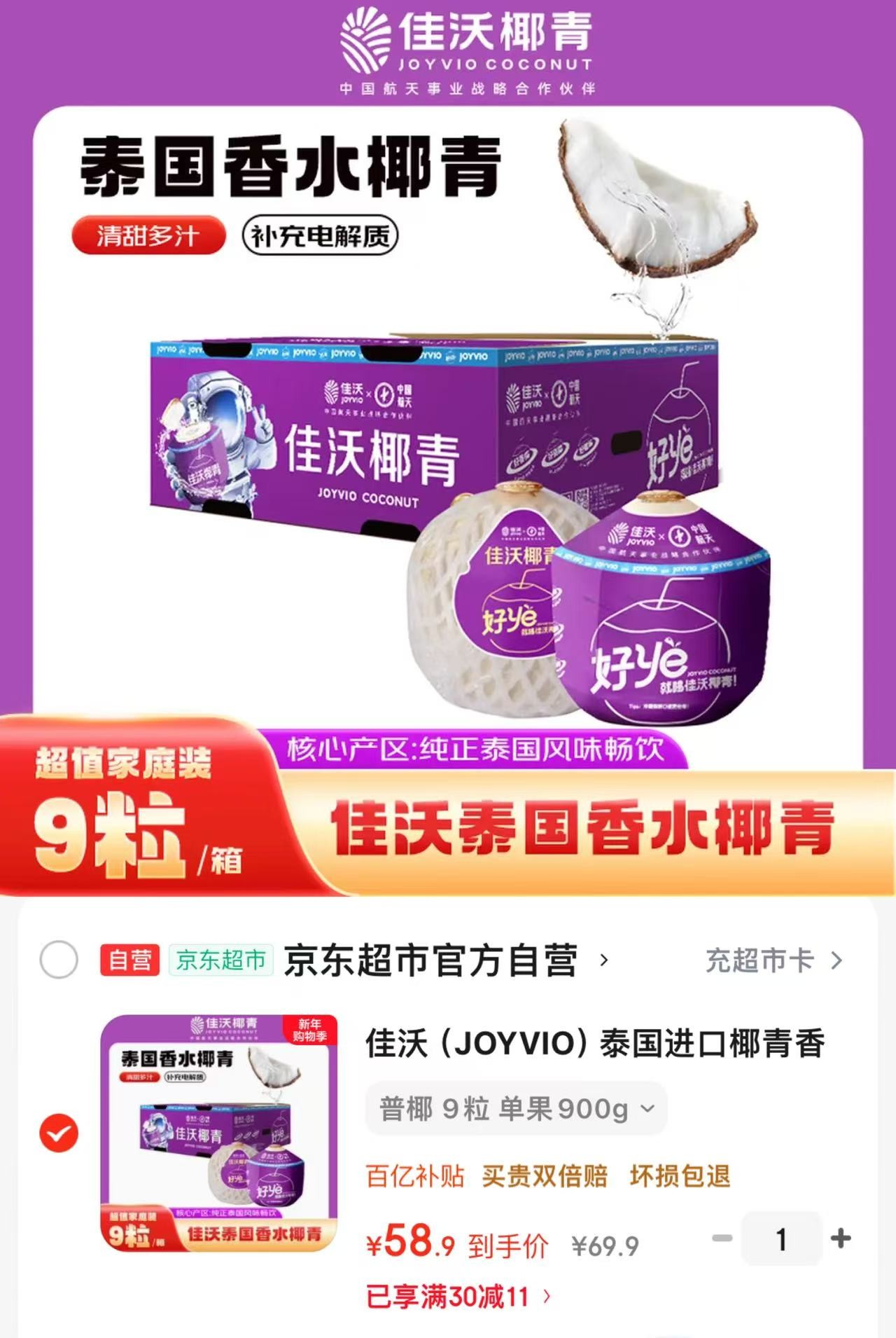 佳沃 joyvio 泰国进口椰青香水椰子9个装 大果900g 水果礼盒【58.9】