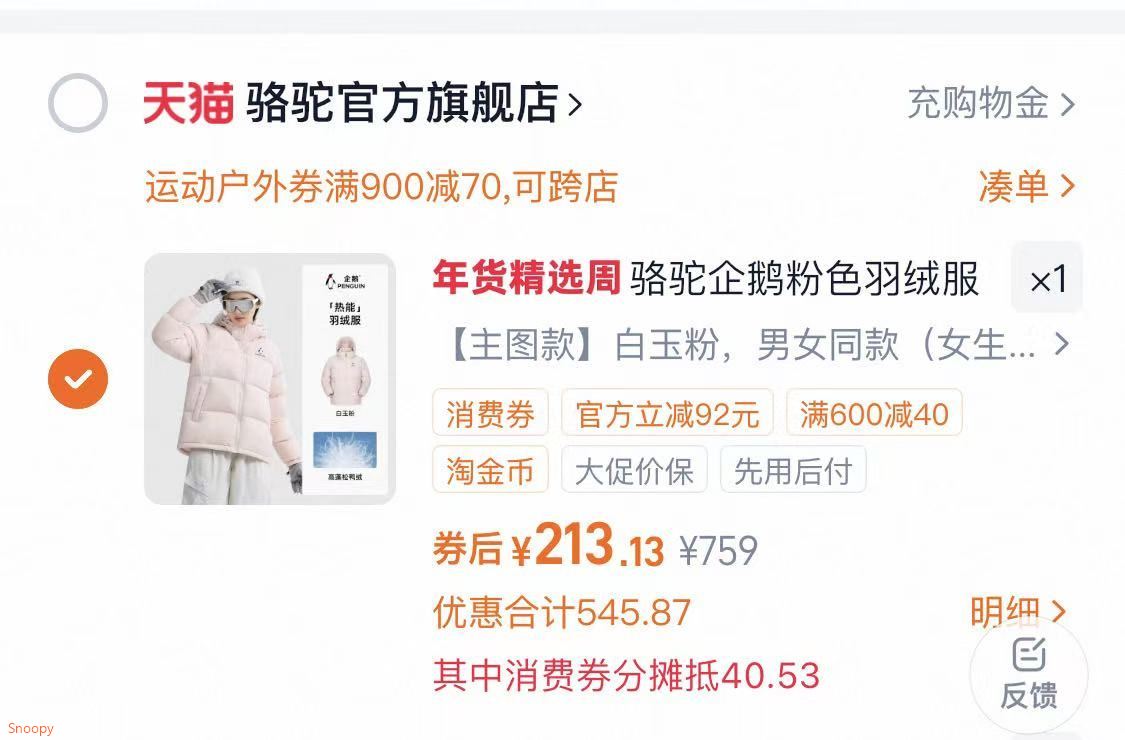 骆驼 企鹅粉色羽绒服面包服