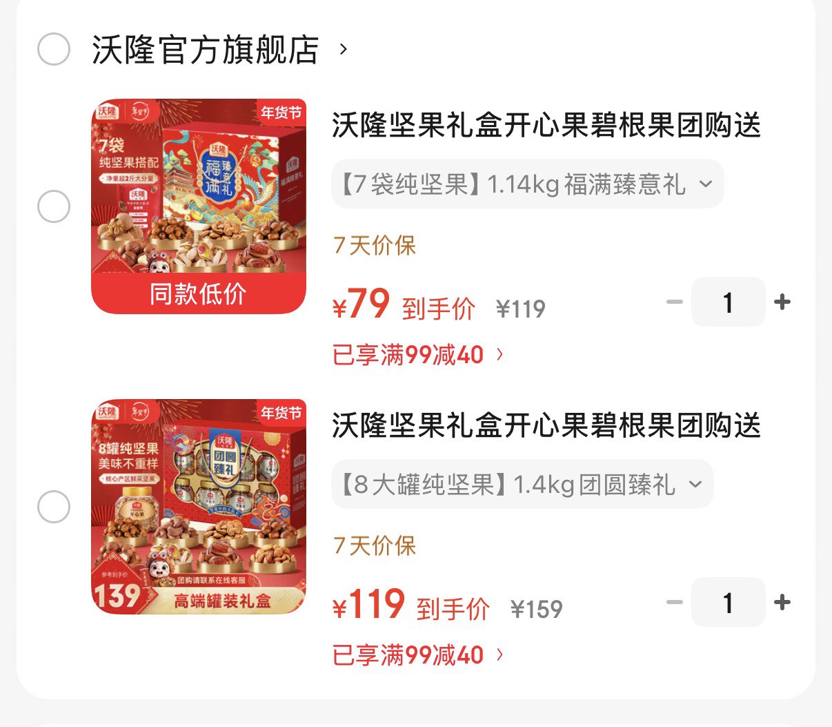 沃隆纯坚果7袋1.14kg礼盒 79元